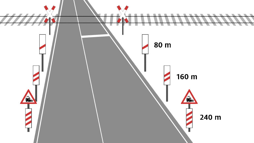 - 240 m: Ankündigung durch das Gefahrzeichen und dreistreifige Barke (80 m pro Balken)