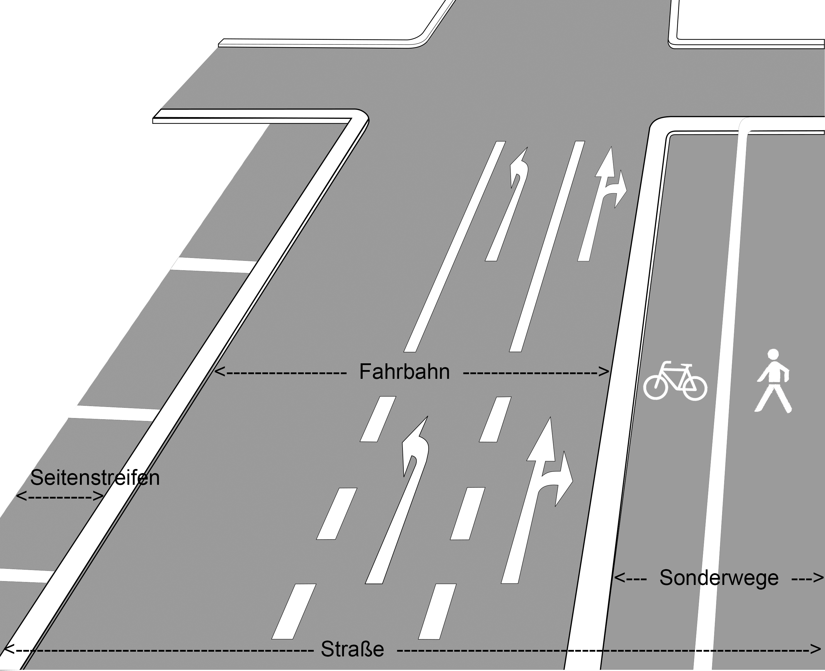 Der Begriff „Straße“ umfasst die gesamte Verkehrsfläche, die für den Verkehr von Fahrzeugen und Fußgängern zur Verfügung steht. Dazu gehören die Fahrbahn, der Gehweg, der Seitenstreifen sowie Sonderwege.