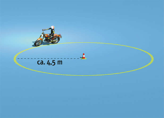 Kreisfahrt Aufgabe:Einfahren in einen Kreis mit einem Halbmesser von 4,5 m (ohne Markierung), mehrfaches Kreis fahren und Verlassen des Kreises. Die Geschwindigkeit ist so zu wählen, dass Schräglage entsteht. Fehlerbewertung:Starkes abweichen vom KreisKeine SchräglageFalscher GangAbsetzen eines Fußes https://book.thommessen.group/wp-content/uploads/Bike-Drehen.m4a