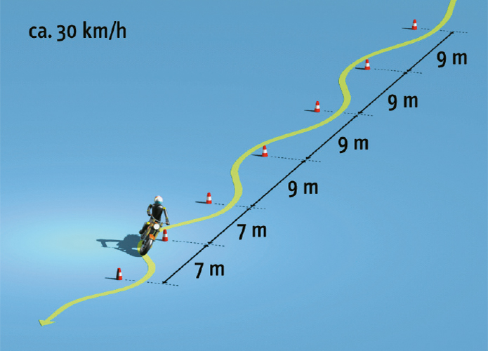 Slalom 4 × 9 m + 2 × 7 m Aufgabe:Eine Slalomstrecke von 4 × 9 plus 2 × 7 Meter mit einer gleichbleibenden Geschwindigkeit von ca. 30 km/h durchfahren. Fehlerbewertung:Zu geringe GeschwindigkeitAuslassen eines FeldesUmwerfen eines LeitkegelsMit einem Fuß die Fahrbahn berühren https://book.thommessen.group/wp-content/uploads/Bike-Schalten.m4a