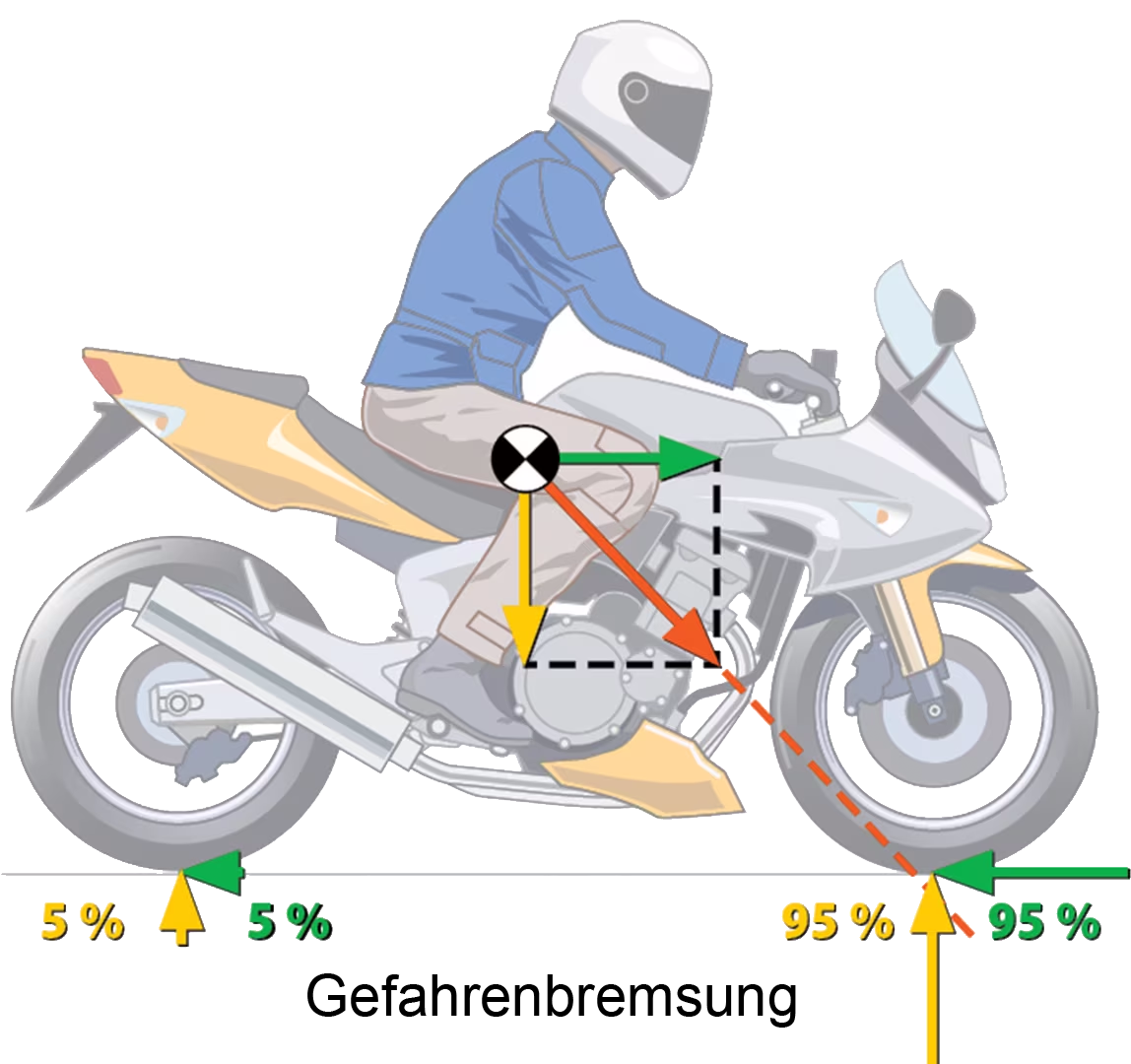 - Die genaue Verteilung hängt von deiner Geschwindigkeit, dem Untergrund und deinem Motorrad ab. Je mehr Gewicht nach vorne wandert, desto weniger Bremskraft kannst du hinten einsetzen.
