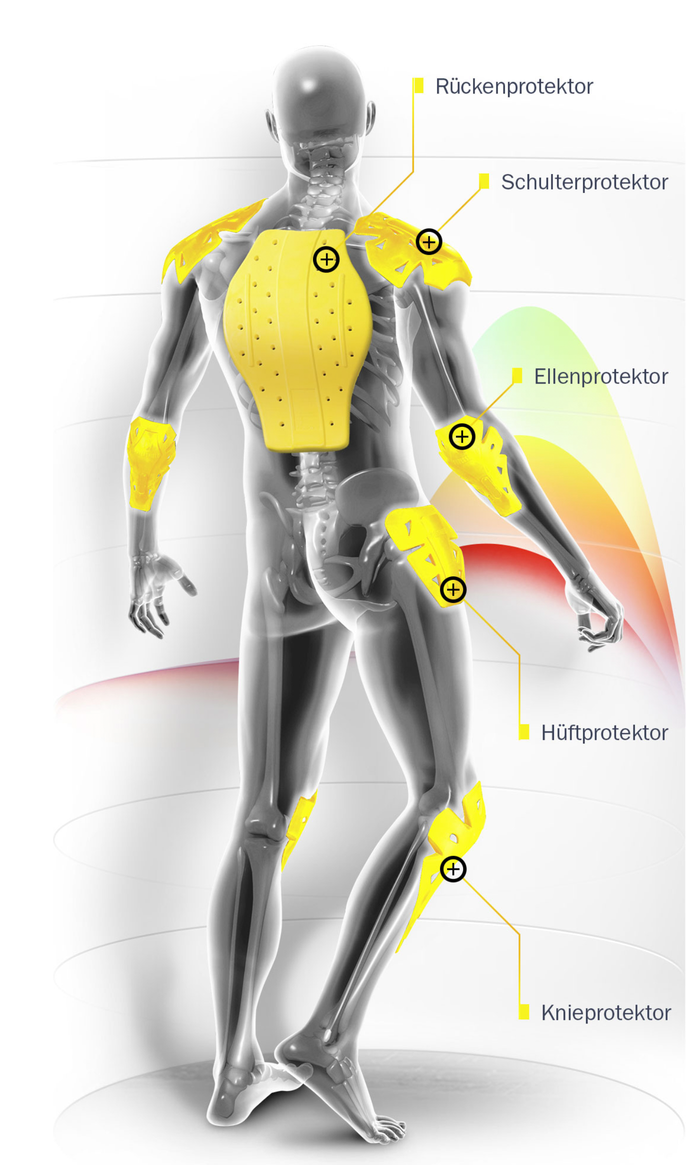 In Motorradschutzkleidung sind oft Protektoren integriert, die empfindliche Körperbereiche wie Knie, Ellenbogen, Schultern, Hüften und den Rücken abdecken. Diese Protektoren dämpfen die Aufprallkräfte bei einem Sturz oder Unfall und können Knochenbrüche oder andere schwere Verletzungen verhindern.